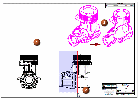将光标置于与绘制轮廓的源视图呈正交关系的图纸视图上,然后将光标从几何体上移过。