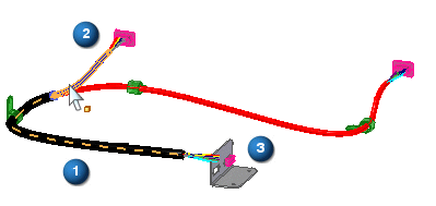 现在可以重新使用路径几何体创建电线、电缆和线扎。下图中,公共路径 (1) 用于为连接到部件 2 和 3 的电线创建线扎。