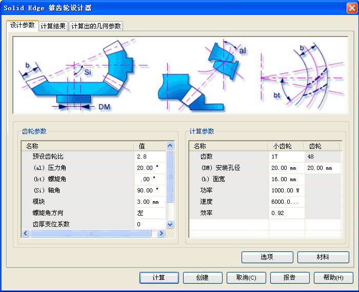 使用此区域可输入用于锥齿轮设计和强度计算的参数。