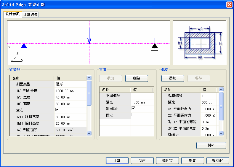 此区域包含横梁的图形化表示。此区域提供的信息是关于当前信息中的力的数量、支撑的数量和支撑类型。
