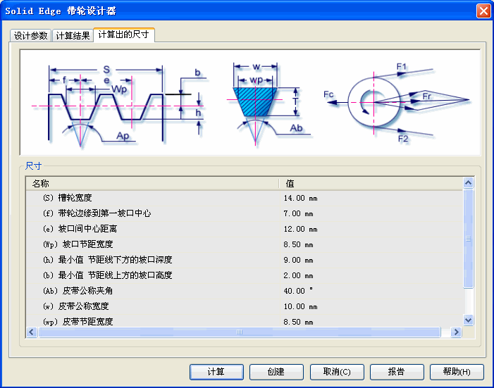 “计算尺寸”选项卡提供的选项用于查看附加计算结果。这些结果定义了用于构造皮带和带轮几何体的参数。因此,这些参数用于创建带轮组的 3D 模型。