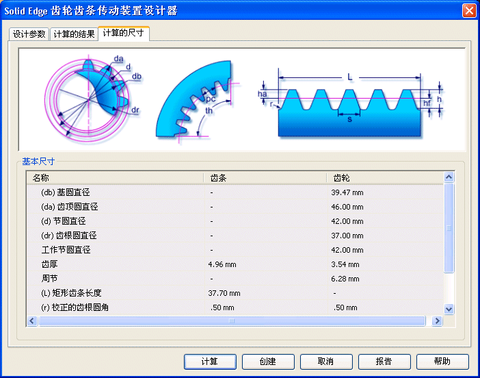 “计算尺寸”选项卡提供的结果参数定义齿轮齿条的几何体。因此,它们用于构建齿条和小齿轮的 3D 模型。