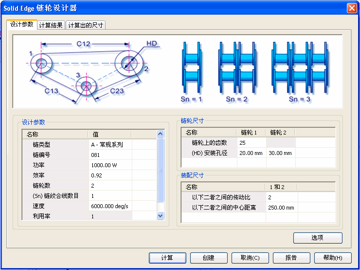 使用此区域定义链轮的具体参数。通过此区域提供的部分重要参数包括:链轮齿数、传动比和中心距离。