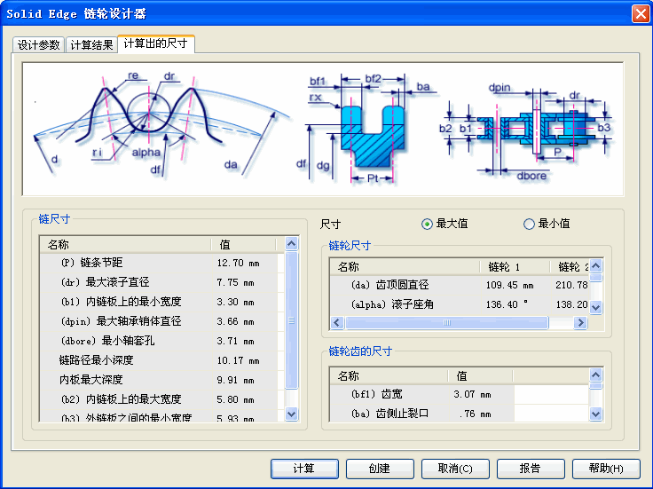 使用“最大”和“最小”选项按钮可以在部分链轮参数的上限范围和下限范围之间切换。可以复查的部分参数包括:齿顶圆直径、滚子座角、齿根面半径。