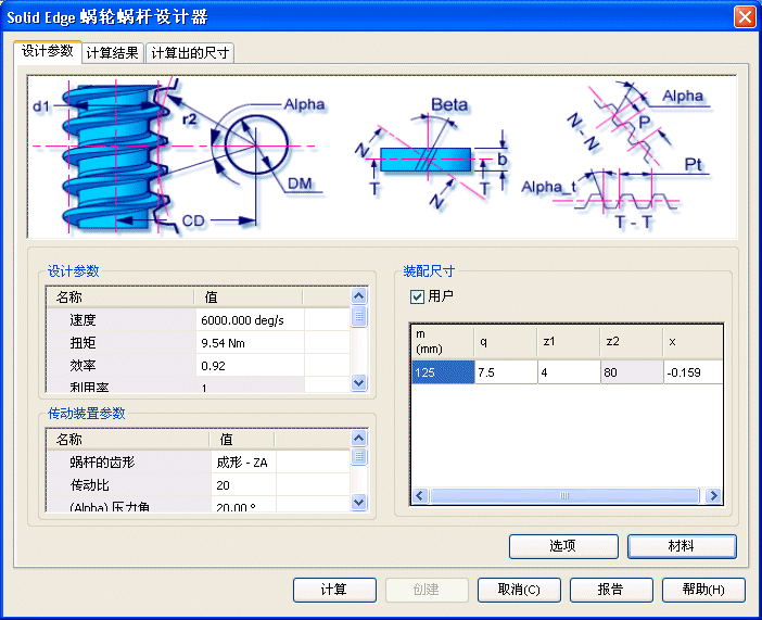 利用此输入条件设置,可在装配尺寸中输入模块 (m)、传动比 (i)、蜗杆上的齿数 (z1) 和单位校正量 (x)。在啮合参数中可输入蜗杆直径系数 (q)。